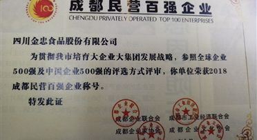 金忠食品喜獲2018成都民營百強企業(yè)、制造業(yè)百強企業(yè)稱號